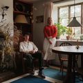 Eddie and Jess pictured in their living room, with a rug by Ishkar underfoot. A ‘Mistletoe Mobile’ by Jess Wheeler Studio hangs above, along with ‘Clematis Wall Lights’ on the wall and a ‘Brass Flower’ candlestick on the table.Elliot Sheppard